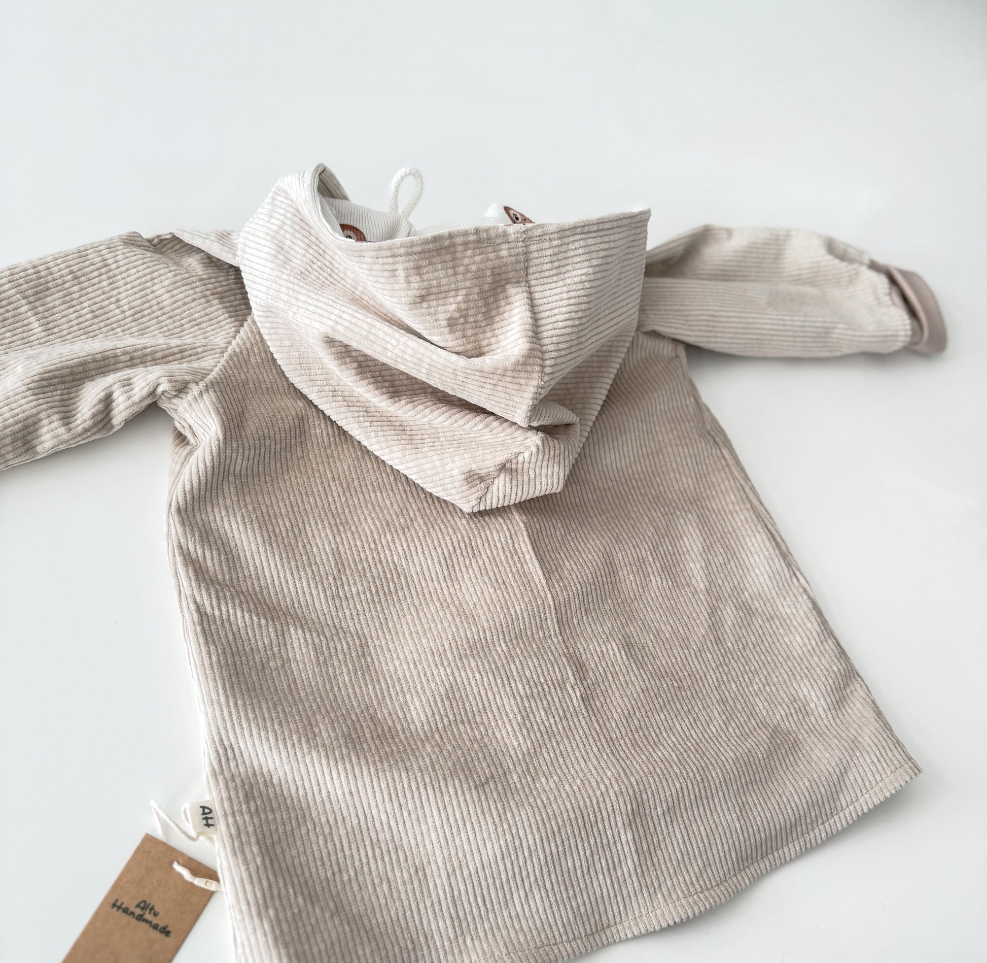 Diese liebevoll handgemachte Cordjacke ist der perfekte Begleiter für kühlere Tage. Gefertigt aus hochwertiger Baumwolle-Cord in Beige und ausgestattet mit einem weichen Teddy-Ribjersey-Innenfutter, sorgt sie für angenehme Wärme und hohen Tragekomfort.
