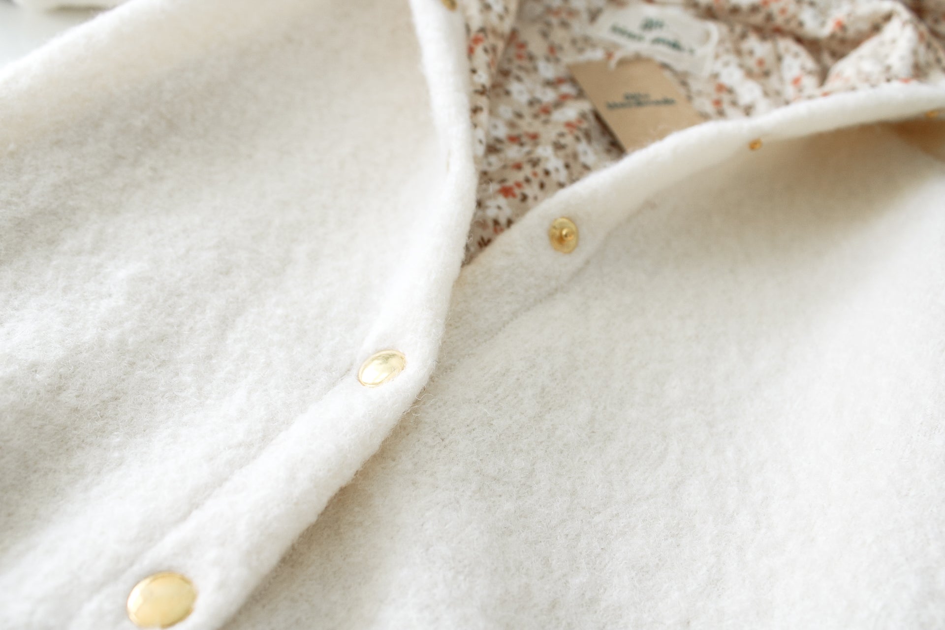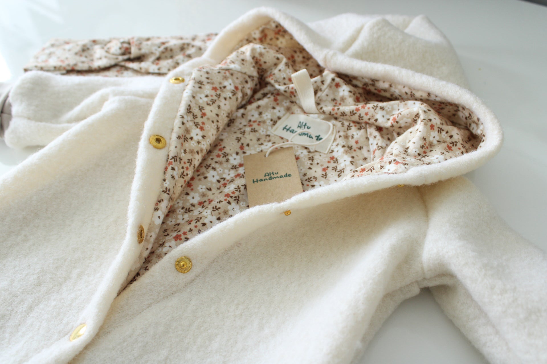 Dieser zauberhafte Wollwalkanzug ist ein echtes Lieblingsstück – weich wie frischer Schnee, warm wie eine liebevolle Umarmung und handgefertigt mit viel Sorgfalt.