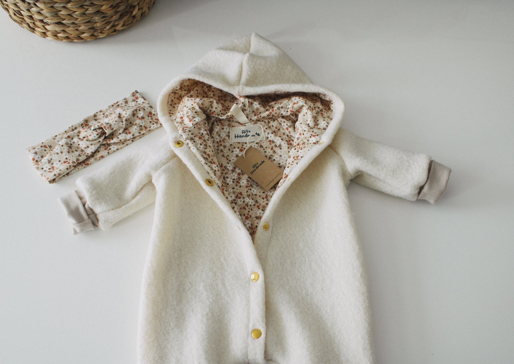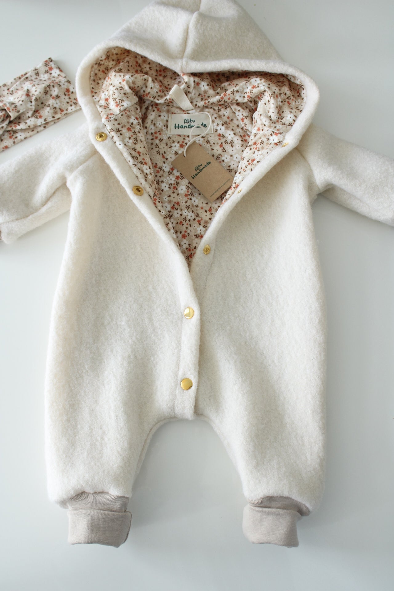 Handgemachter Wollwalkanzug aus 100 % Schurwolle – Größe 68 (Weiß)