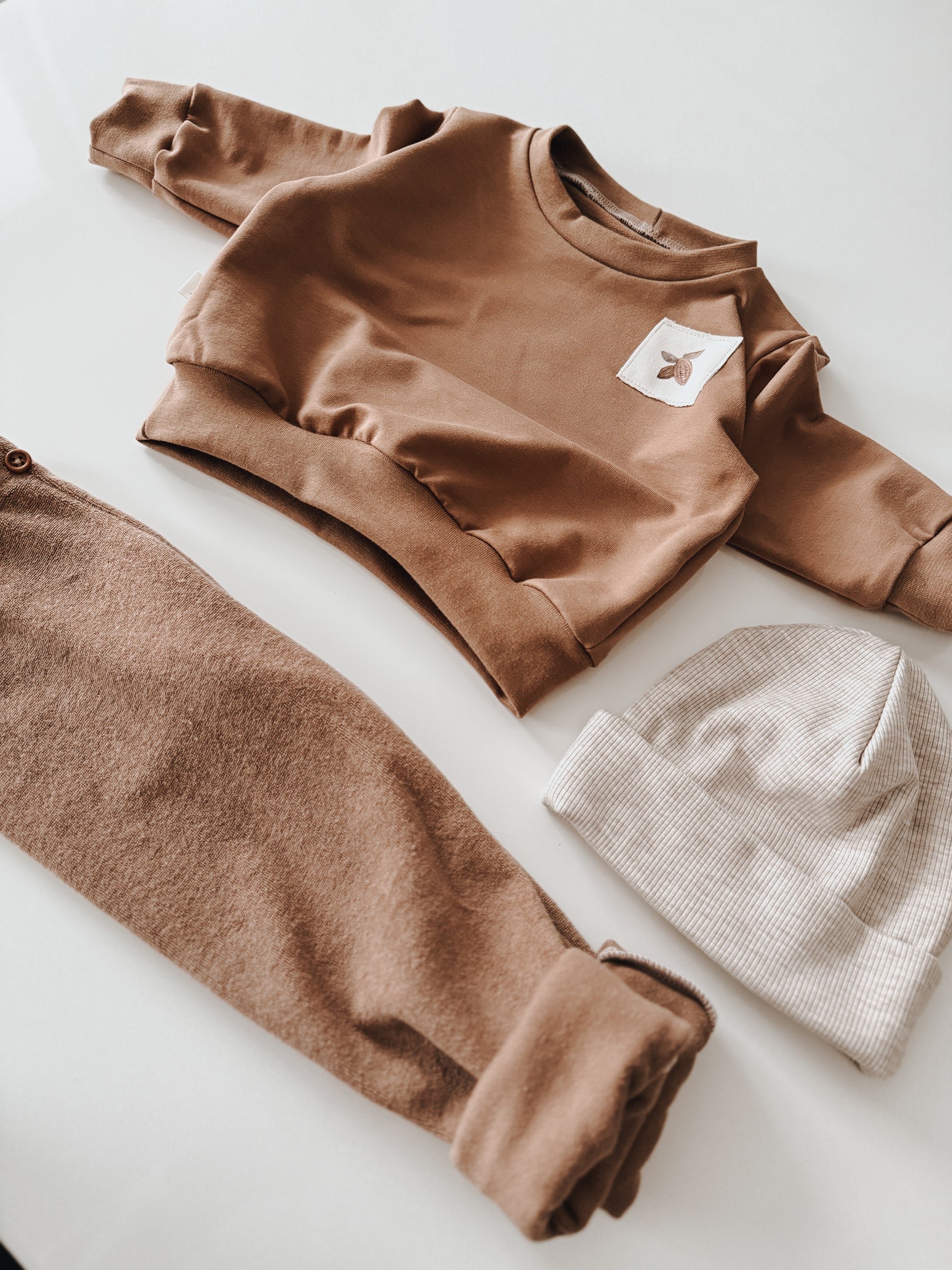 Wunderschöner Pullover aus Baumwoll-French-Terry mit süßem Kakaobohnen-Patch. Perfekte Ergänzung zu unseren Cacao- oder Frottee-Leggings 🤎