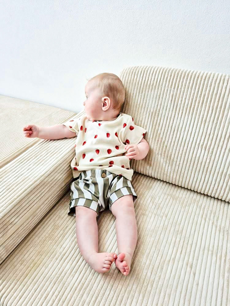 Dieses liebevoll genähte Kinder T-Shirt aus Rippjersey überzeugt mit einem süßen Erdbeer-Muster und hohem Tragekomfort. Der weiche Baumwoll-Rippjersey ist dehnbar, atmungsaktiv und besonders angenehm auf der empfindlichen Kinderhaut – ideal für Frühling und Sommer.