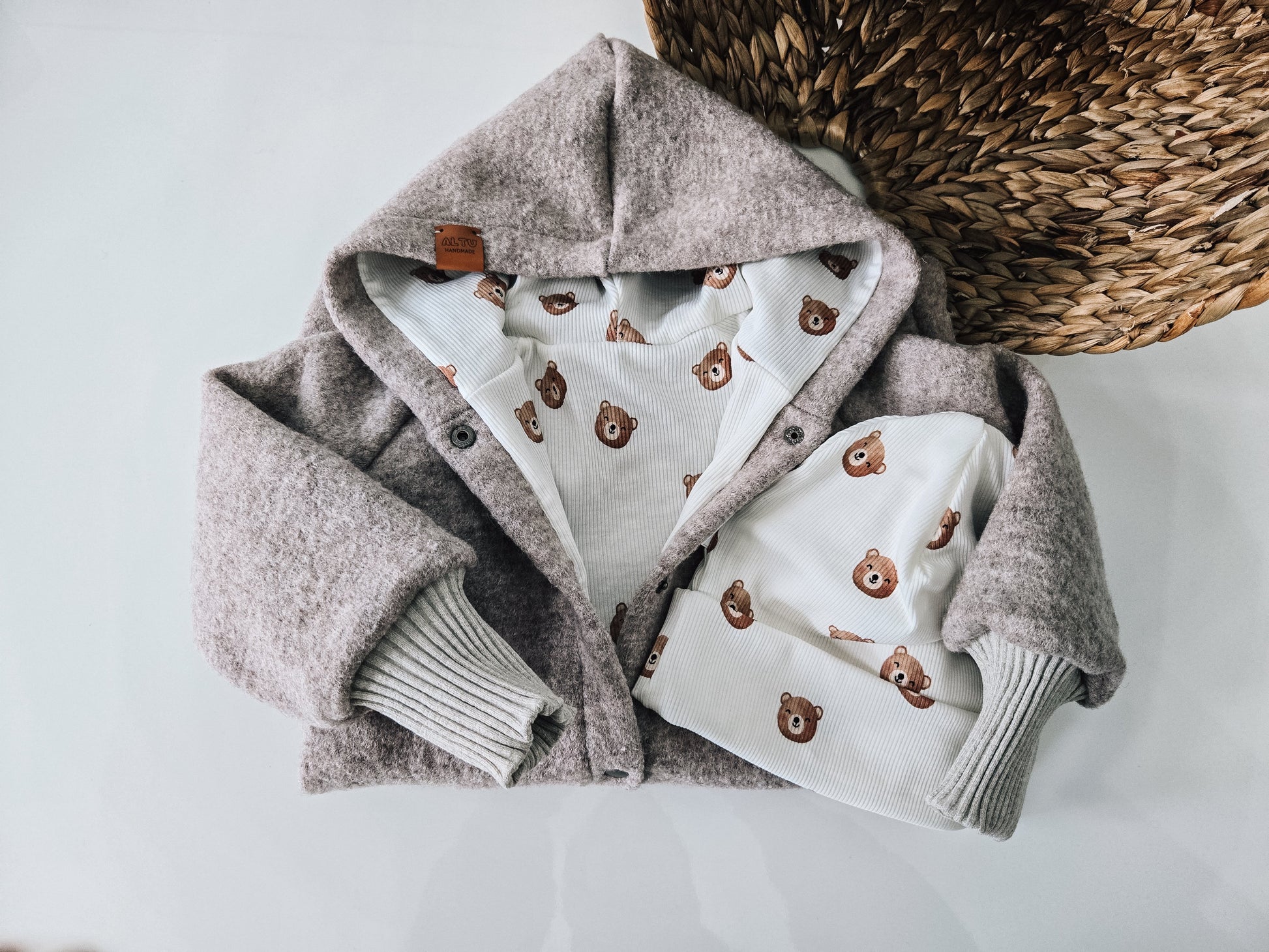 Auf Wunsch kannst Du den Walkoverall auch mit passendem Loopschal und Mütze bestellen – für ein rundum kuscheliges Outfit.